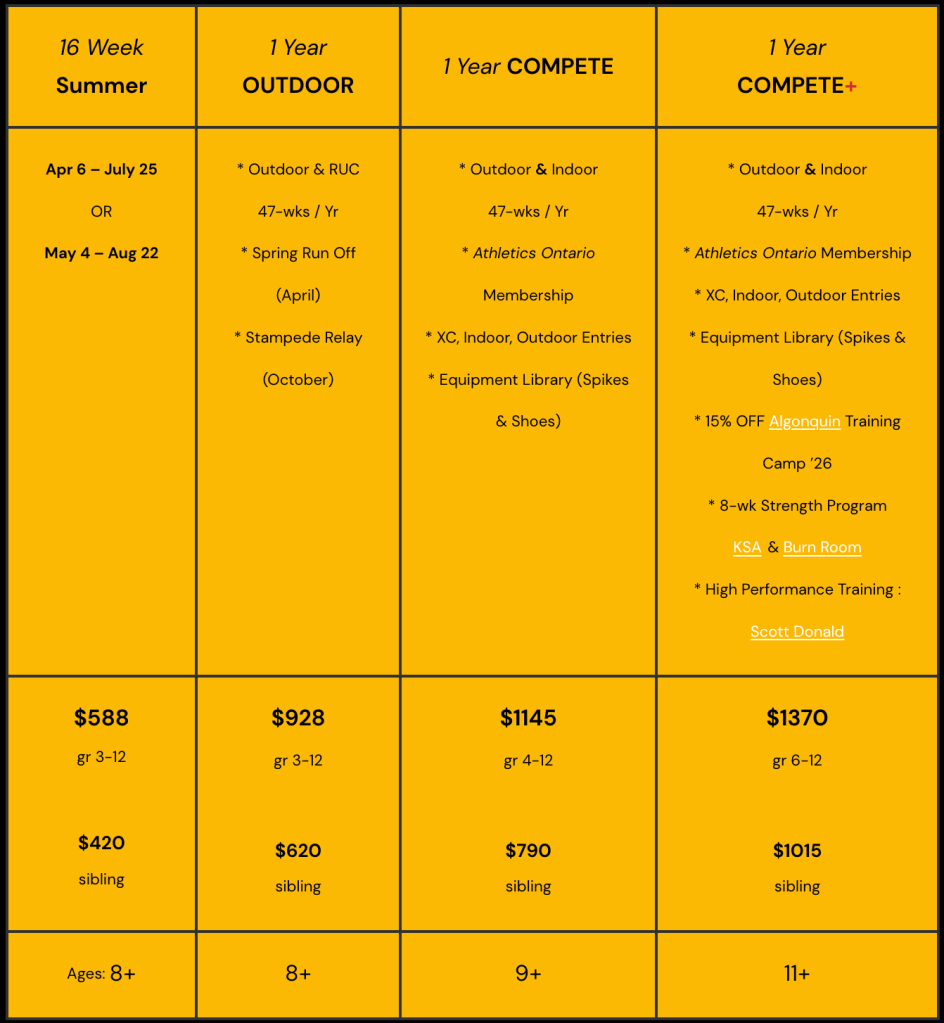 We compete at local, provincial, and national levels, with both Recreational and Full Competition memberships offering year-round training for athletes of all paces and experience levels.