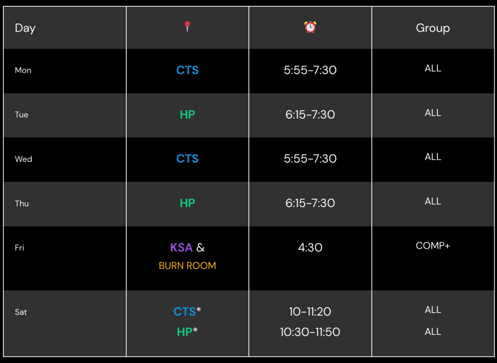 Workout Schedule MAR 16 – NOV 15, 2026